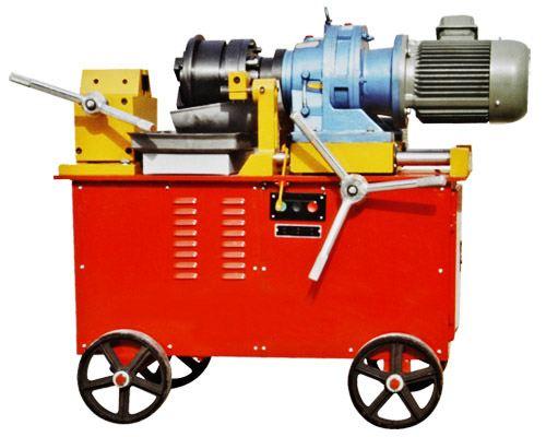 將鋼筋?yuàn)A緊,剝肋滾絲頭轉(zhuǎn)動(dòng)并作軸向進(jìn)給完成螺紋加工。剝肋滾絲頭轉(zhuǎn)動(dòng)是由主電機(jī)經(jīng)減速機(jī)以50轉(zhuǎn)每分的轉(zhuǎn)速完成。進(jìn)給由操作員扳動(dòng)手柄經(jīng)齒輪、齒條帶動(dòng)減速機(jī)及剝肋滾絲頭沿滑杠運(yùn)動(dòng)完成。