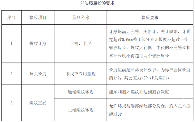 1、檢驗項目。絲頭加工現(xiàn)場檢驗項目、方法及要求見下表。